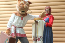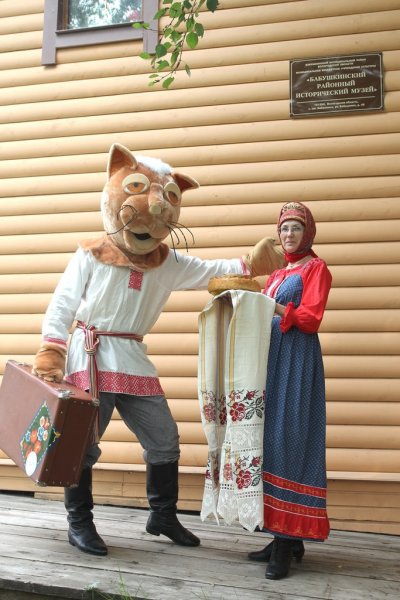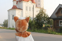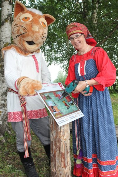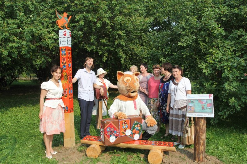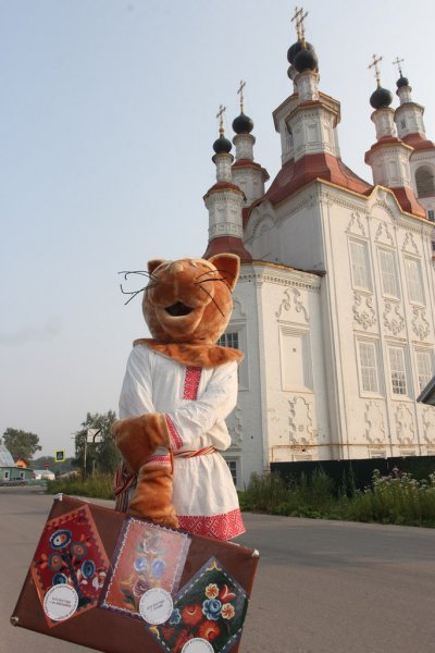 В лучах яркого солнца заиграла всеми красками тотемская роспись. Размашистые объёмные цветы на сурике и лев, напоминающий собачку, привлекли внимание и Кота Семёна. Неожиданно появившись из зарослей кустарника, он нацелил объектив фотоаппарата на роспись. Уже через мгновение появилась памятная фотография. Семён быстро нашёл ей место, прикрепив на крышку чемодана, с которым он в путешествии никогда не расстаётся, ведь там хранятся игры с росписями для детей и взрослых.