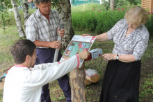Завершающим сюжетом церемонии открытия арт-объекта на тотемской земле стало скрепление творческого союза между партнёрами проекта. Директор Тотемского музейного объединения Новосёлов Алексей Михайлович, автор проекта, руководитель музея "Семёнково" - Киршина Наталья Олеговна и научный консультант, заведующий художественным отделом Вологодского музея-заповедника - Глебова Ангелина Аркадьевна установили информационную панель с картой туристического маршрута "Дорогами грифонов и райских кущ", вкрутив последние винтики в успех начинания.