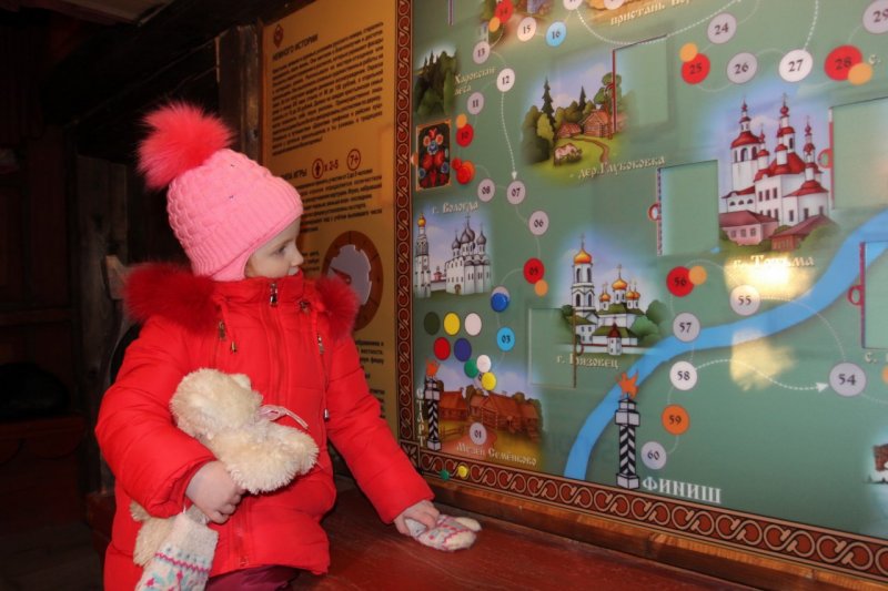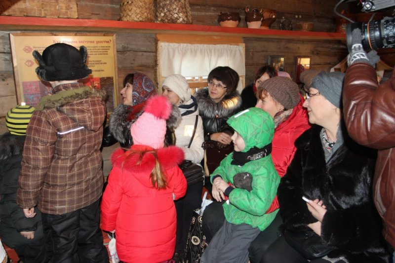 Дети быстро перехватили иннициативу от Кота Семёна, старались не сориться, отвечать на вопросы, без устали тестировали игровые модули. А взрослые меж тем обращали внимание на детали музейной экспозиции, на художественные работы мастеров, представленные в интерьерах крестьянской избы.
