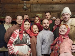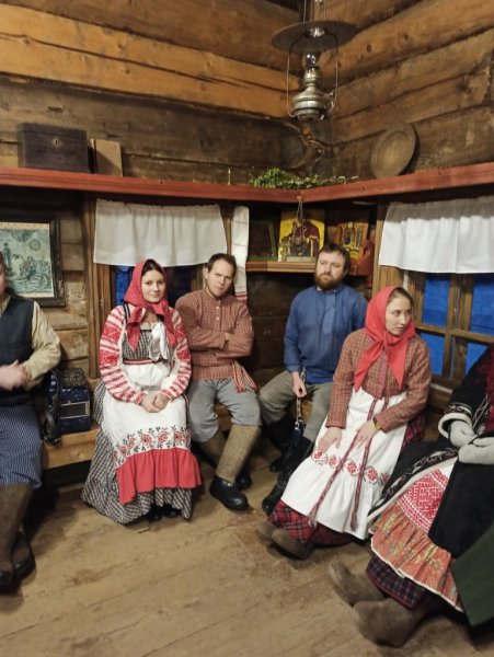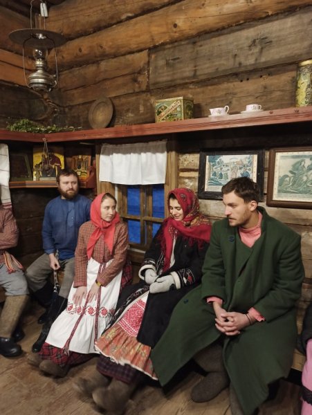 В музее «Семёнково» Евгению и Виктора уже поджидали участники Фольклорно-этнографического театра музея «Семёнково». Под задорные наигрыши гармони и вологодские частушки гостей проводили в экспозицию «Музей масла». Маслодел Михаил и его супруга Дуняша «задворили» корову, а затем предложили гостям сбить сливочное масло. После работы и отдохнуть не грех. На вечёрке гостей уже поджидали… Витя и Женя живо присоединились: в образ вошли, песни пели, «Метелицу» плясали, частушками друг друга забавляли.