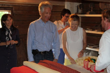 Гости осмотрели весь дом. Поднявшись по широкой лестнице, обрамлённой точёным балясником на второй этаж, увидели недавно приобретённую музеем заборку, выполненную в свободно-кистевой манере. По всей вероятности, работал над ней когда-то опытный и умелый мастер, выработавший с годами свой авторский почерк. Её в ближайшее время предстоит отреставрировать на средства Гранта и установить в верхних сенях.