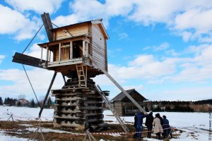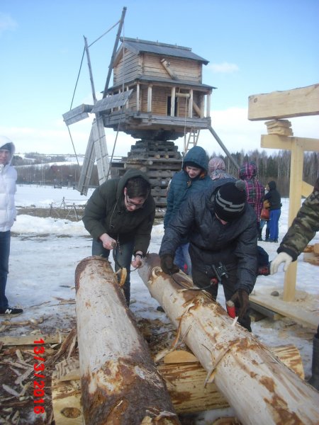 А неподалёку на пригорке мельница мелет зерно, и мужики весело толкуют о том, что в скором будущем появится ещё один ветряк в деревне да с толчеёй, который будет перерабатывать зерно в крупу. Все желающие: и взрослые, и дети, пришедшие в "Семёнково", могли внести посильный вклад в строительство и поучаствовать в обработке брёвен для лафета будущего амбара мельницы.