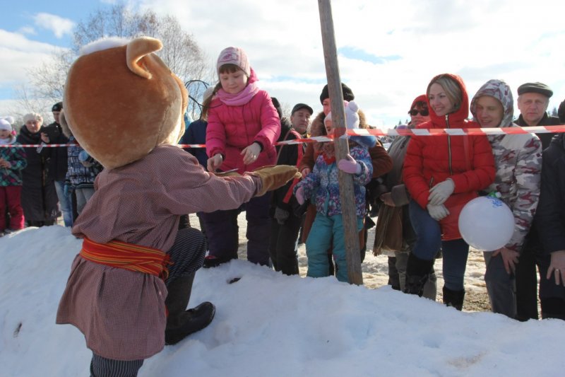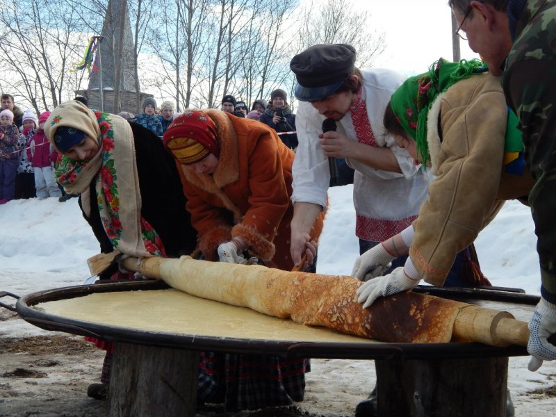 Плотным кольцом окружают любопытствующие зеваки место, где играет языками пламени в огромной жаровне огонь, и кипят споры между хозяевами праздника о степени накала сковороды и её готовности к выпечке блина.