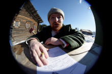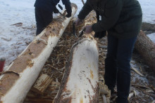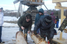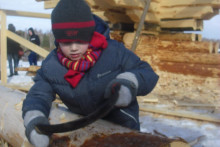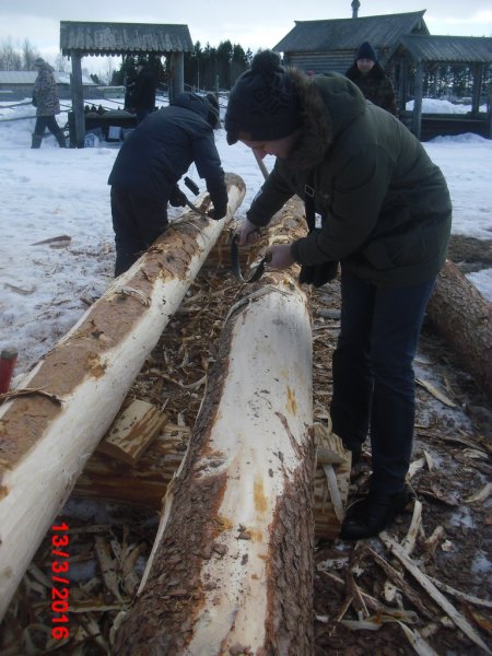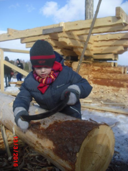 Со скобелем в руках гости праздника корили брёвна, постигая плотницкое ремесло.