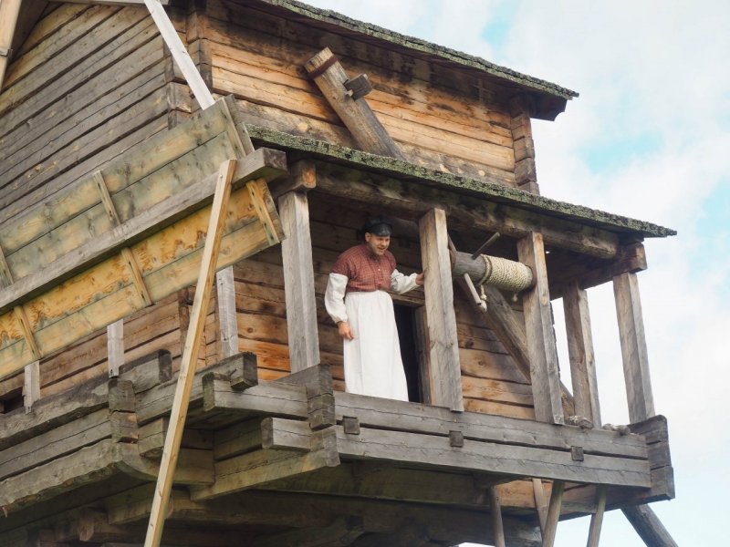 посетители музея развернули мельничный амбар при помощи механизма для разворота по ветру, запустили огромные крылья - "махи" и оценили первый помол муки.