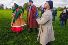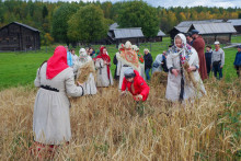 Отправившись гулять по деревне, гости музея присоединились к местной молодёжи, которая собралась на жатву. "Зерно в колосе - торопись сжать полосу". Ловко посетители музея за "деревенскими" поспевали, орудовали серпами. Снопы вязали, последнюю полосу дожинали.