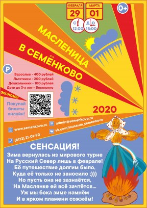 Масленица – испокон веков считалась порой широкого разгула, «Масленица в Семёнково» - это ещё и время открытого показа. Ведь речь идёт о празднике в музее. Вот уже 9 лет подряд в центре всеобщего внимания оказываются мельницы! Они наравне с самой масленицей и блинами - главные герои и участники происходящего. Как родители радуются первой улыбке своего младенца, так и музейщики, затаив дыхание, следят за ходом реставрационных работ на объектах. С нетерпением ждут и надеются, когда очередная мельница вырастет, окрепнет, встанет на крыло и зашумит в такт ветру.