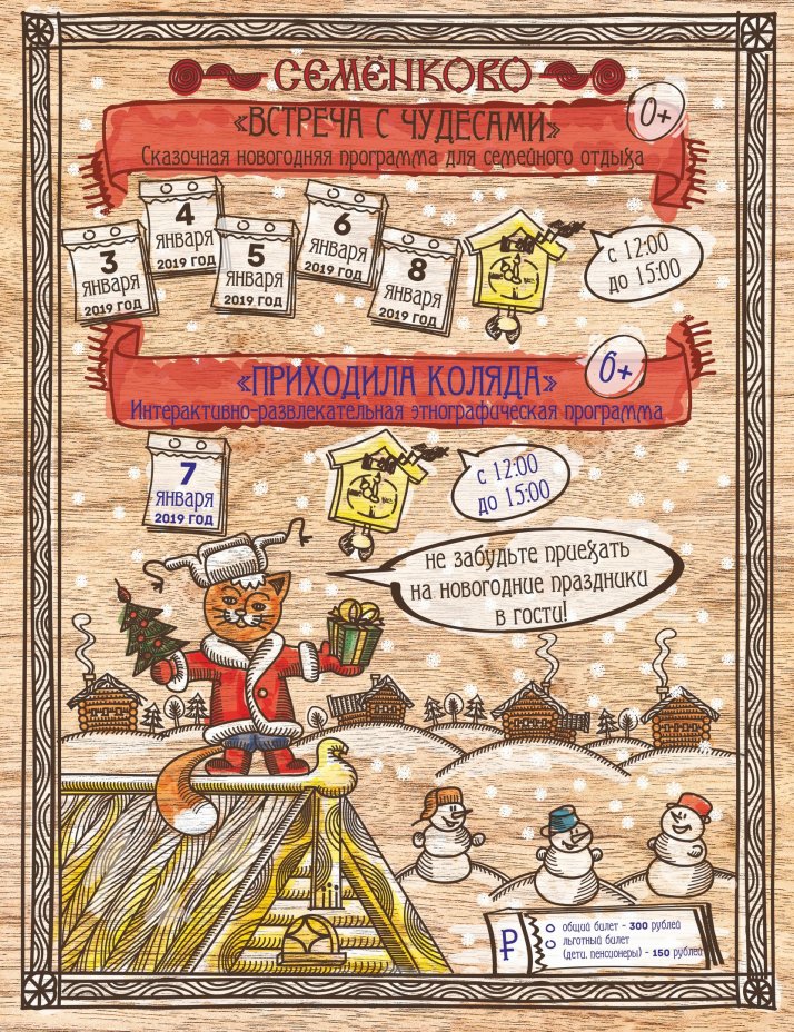 7 января, в праздник Рождества Христова, в музее пройдёт интерактивная этнографическая программа «Приходила Коляда». Ожившие сцены деревенской жизни станут настоящим откровением и подарком для путешественников, открывающих для себя Русский Север! Вдыхая зимнюю прохладу и созерцая красоту деревни, ощутите глубину народной традиции! Испытайте светлую радость от встречи с колядой и подивитесь настоящему вертепному представлению. В пору "безвременья" наипервейшее дело: выпустить дух и пуститься в пляс! Гадания, ряженье, поцелуи пачками - это и многое другое ждёт вас в "Семёнково"!