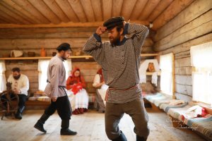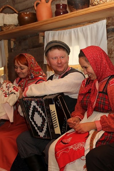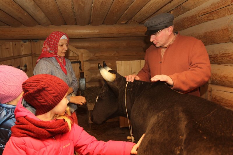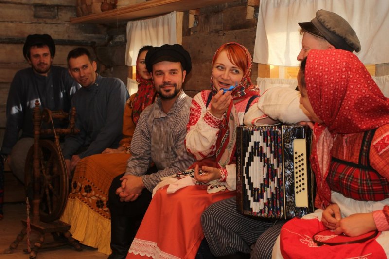А в это время музей «Семёнково» потихоньку наполнялся людьми. Экскурсоводы подхватывали гостей «со всех волостей», увлекая в удивительное путешествие во времени. А чем жила деревня XIX века в осеннюю пору? У Жуковых прясть научились, у Поповых на посиделках поплясали да поиграли, Надежду к Валентину «припели», коновала повстречали, на сватовстве, на мастер-классах побывали, чай с блинами попивали.