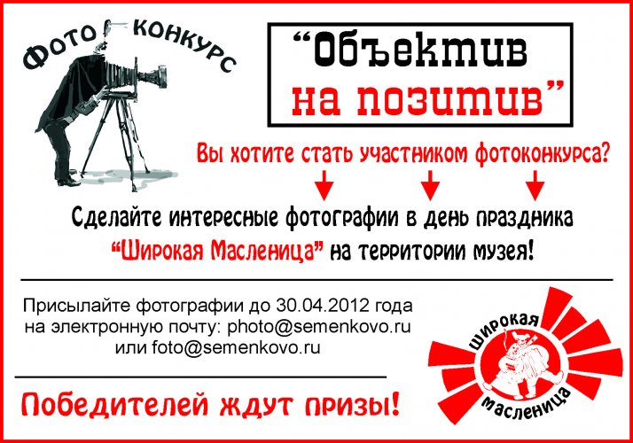 Музей "Семенково" объявляет о том, что в рамках праздника "Широкая Масленица" будет проходить конкурс "Объектив на позитив".