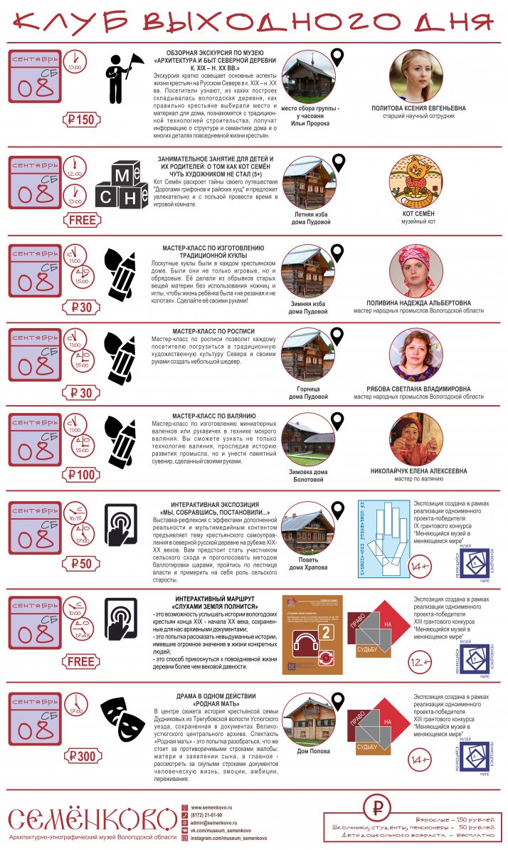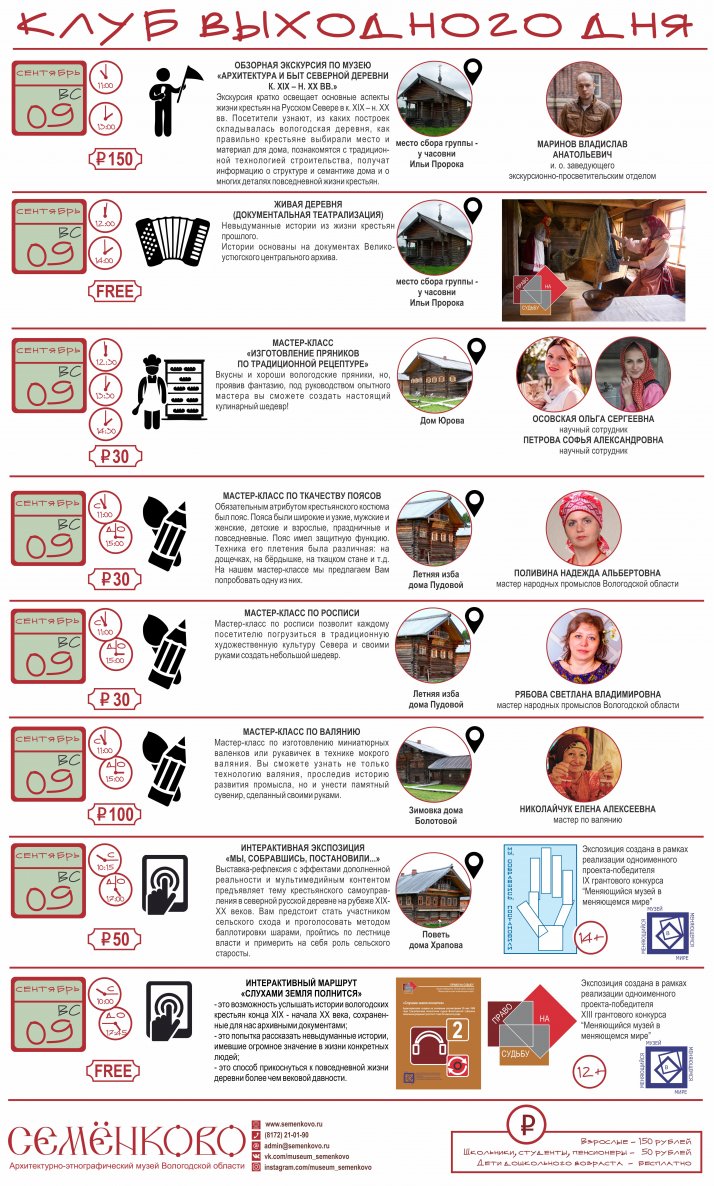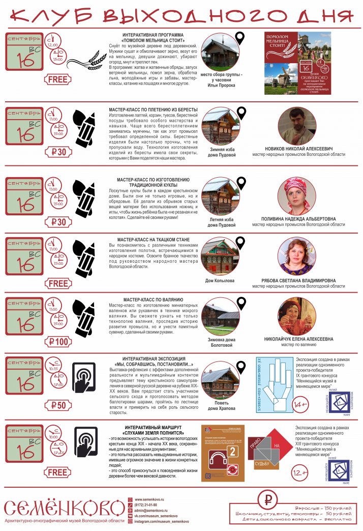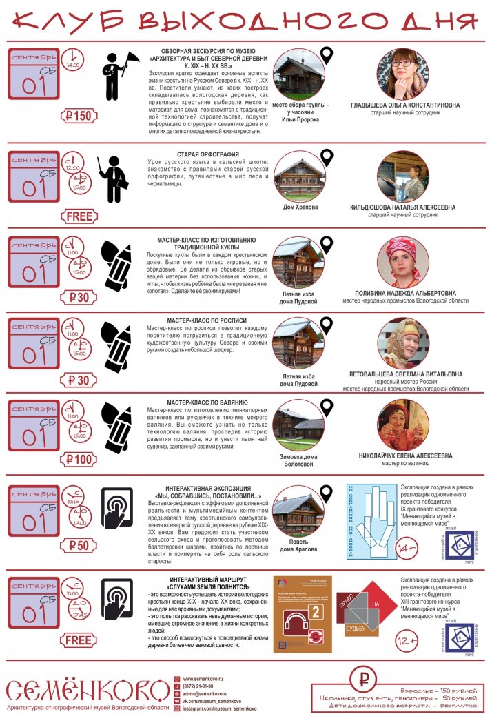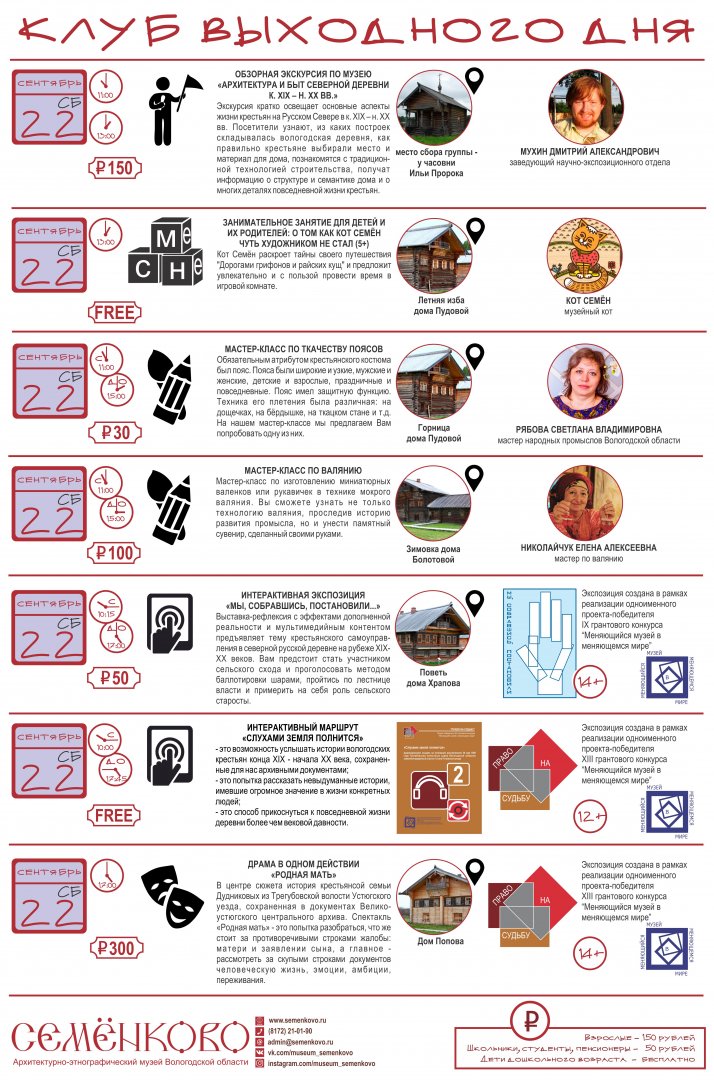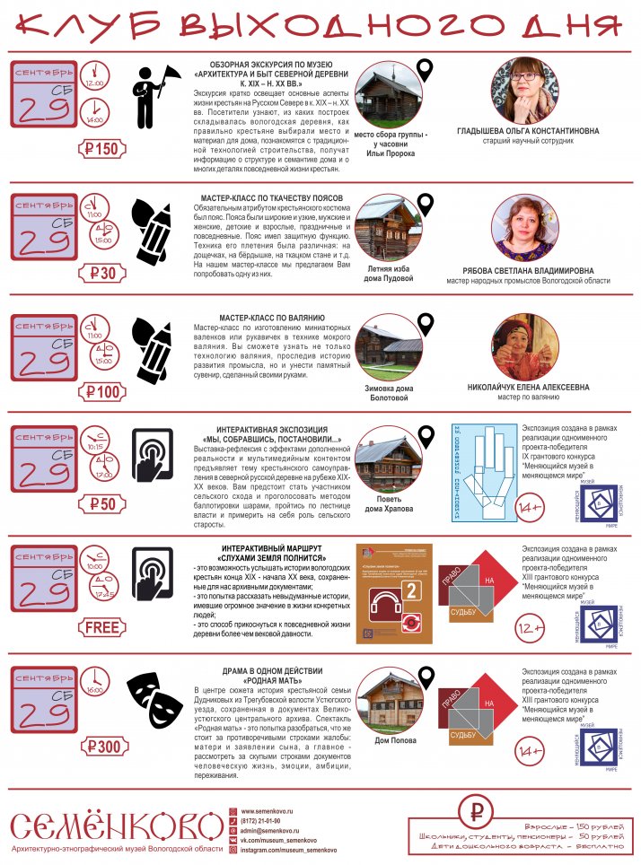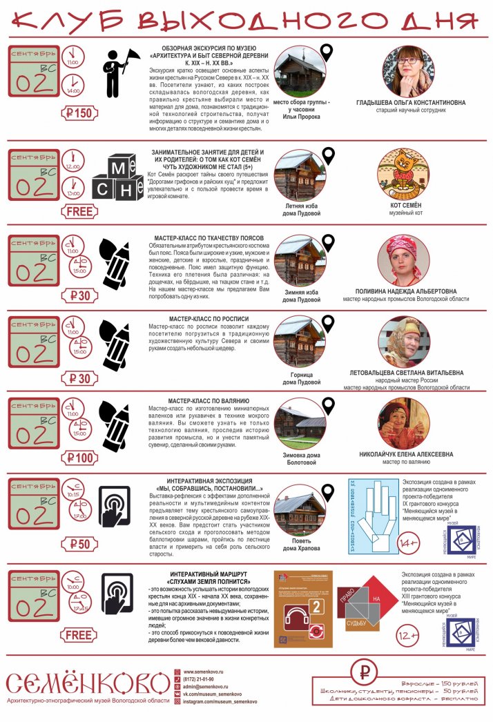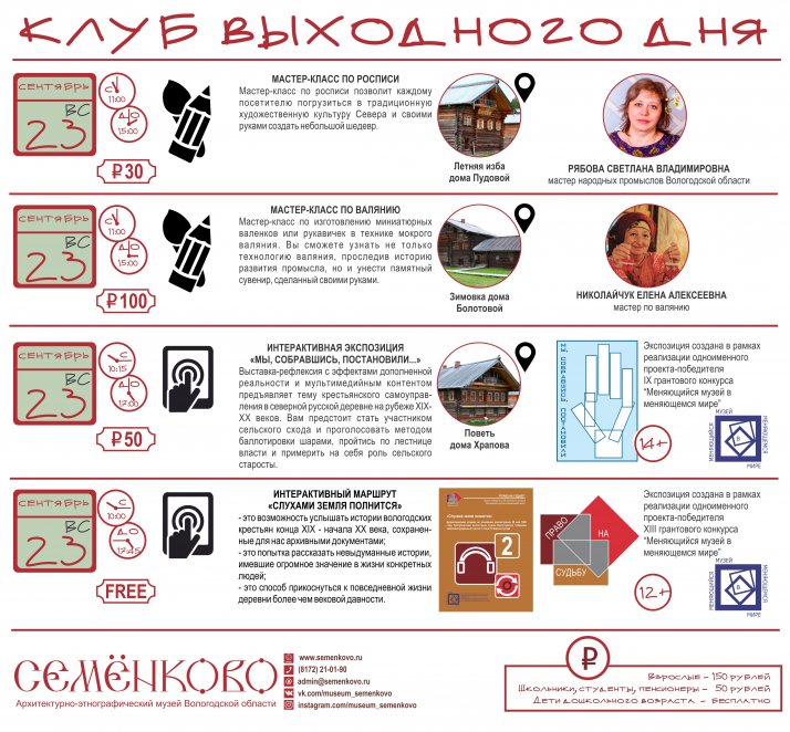 В эти выходные заканчивает свою работу "Клуб выходного дня" в музее "Семёнково". Не упустите последнюю возможность прогуляться по осеннему музею "Семёнково". 29 и 30 сентября вы сможете получить дополнительные музейные услуги: экскурсии и мастер-классы без предварительной записи.