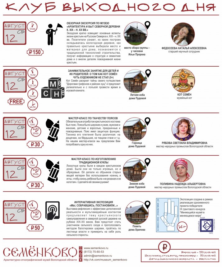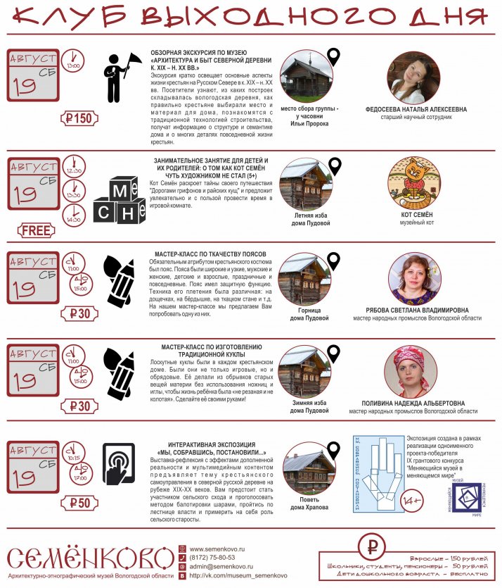 Кроме того каждые выходные для вас работают мастер-классы, лекторий, проводятся экскурсии и интерактивные программы, посетить которые вы можете без предварительной заявки. Познакомиться с программой Клуба выходного дня можно на сайте и в группах социальных сетей Bконтакте и Facebook.