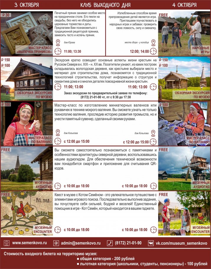 У вас есть возможность не только познакомиться с миром северной русской деревни рубежа XIX - XX веков, удивиться крестьянской изобретательности и практичности, но и покачаться на качелях, отдохнуть в беседке, укрывшись от солнца, а также принять участие в мероприятиях "Клуба выходного дня".
