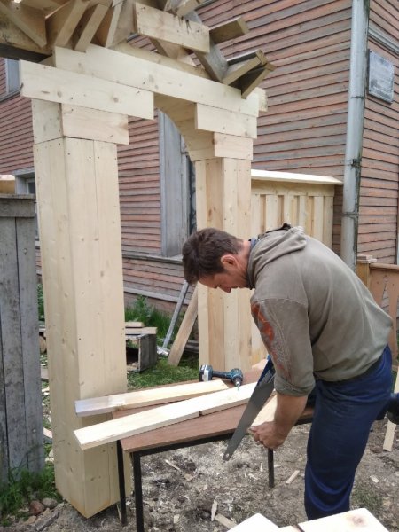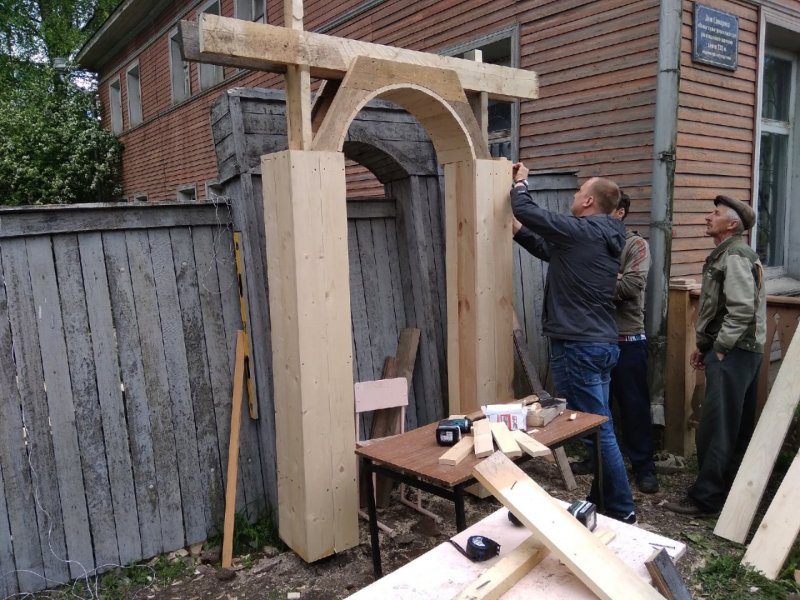Теперь сложно пройти мимо этой красоты, не задержав взор на добротно выполненной работе. Массив из свежего дерева выглядит эффектно и самобытно благодаря использованным декоративным приёмам: искусно сделанной обшивке, деликатной резьбе по дереву, сохранённым кованным петлям и ручкам в виде колец. Украшением входа являются и причудливые арки с двух сторон от центральных распашных ворот, опирающиеся на деревянные колонны. Свежее, благородно-золотистое дерево в лучах солнца выглядит сейчас удивительно парадно и празднично. И мы не удивимся, если в скором будущем найдутся желающие из числа гостей нашего города, да и вологжан, кто захочет запечатлеть объект и сфотографироваться на фоне этой красоты.