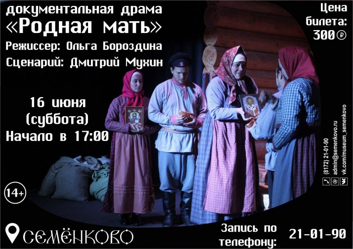 16 и 23 июня 2018 года в Антропологическом театре Музея "Семёнково" пройдёт спектакль «Родная мать»! Открыто бронирование билетов. Помните, количество мест в зрительном зале ограничено.