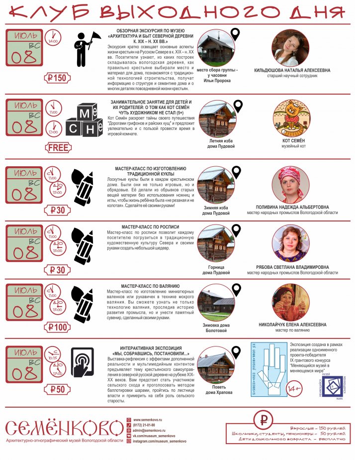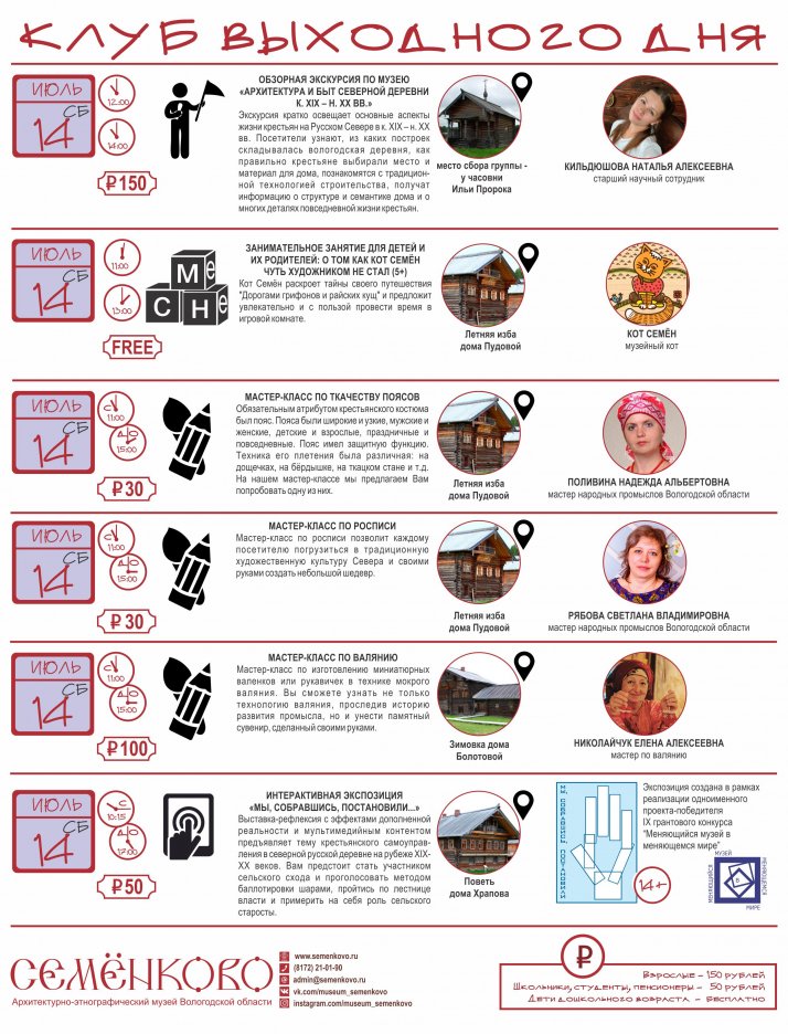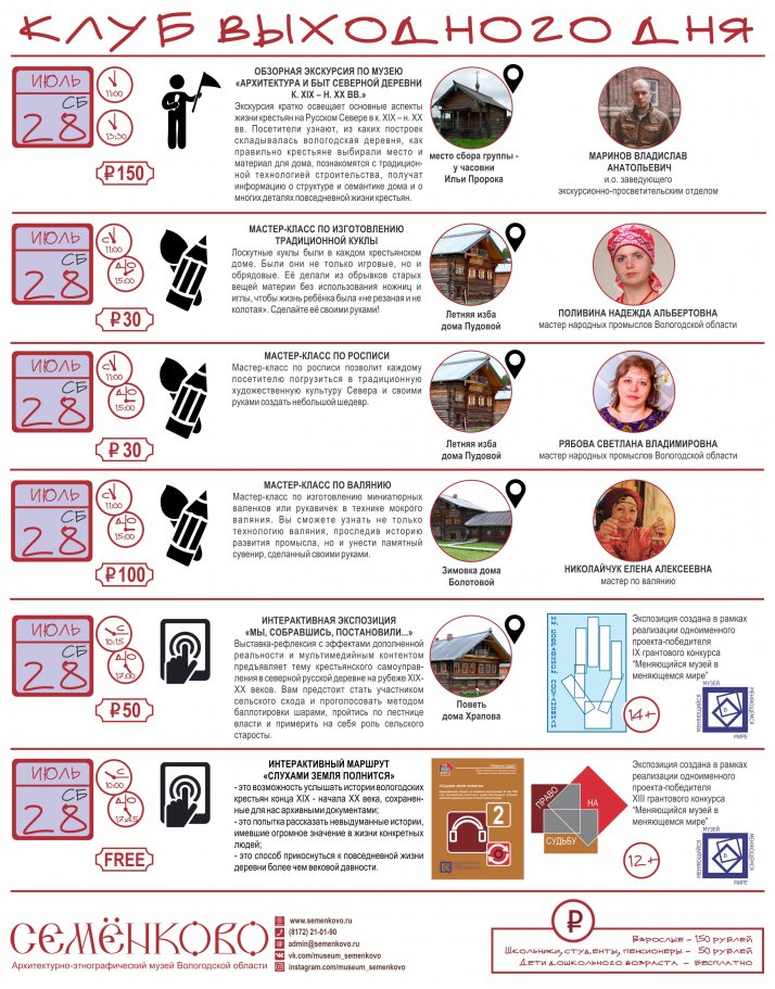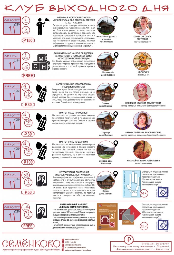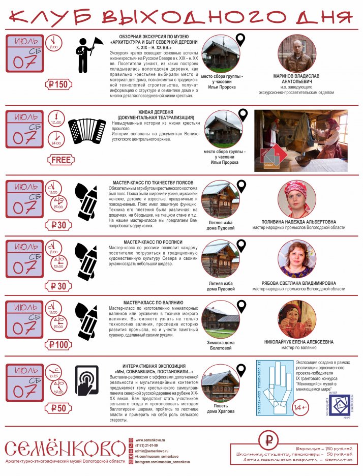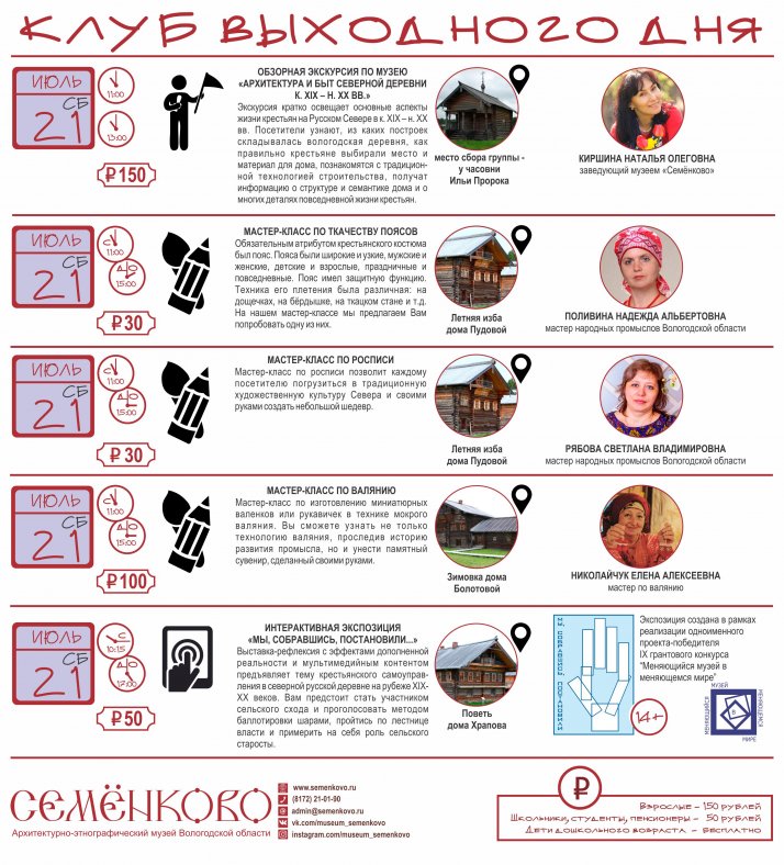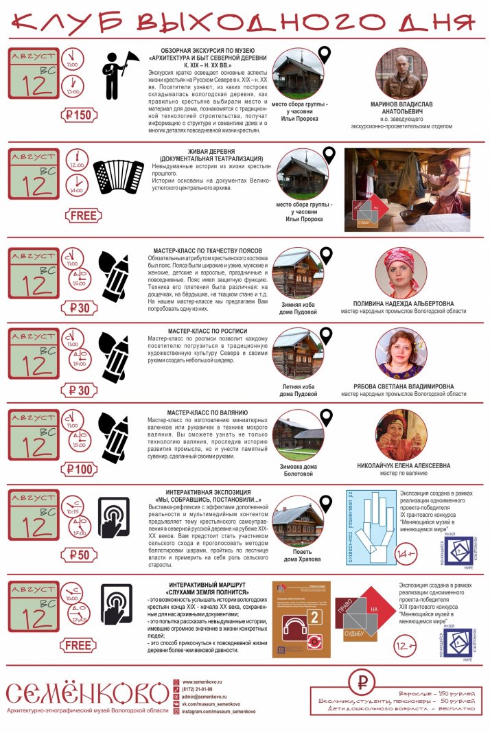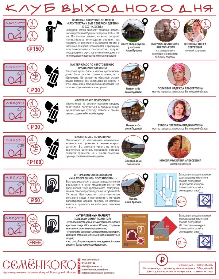 Музей "Семёнково" приглашает вас в гости на выходные. В рамках клуба выходного дня вы без предварительной заявки можете получить дополнительные музейные услуги: экскурсии, мастер-классы, интерактивные зарисовки...