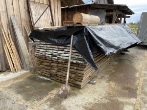 Силами ремонтно-реставрационной службы изготовлен кровельный тёс, он обработан антисептиком, появились курицы и часть причелин. На