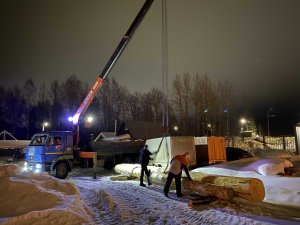 В этот же день удалось при помощи крана разместить в мельнице несколько крепких 7-метровых закладных брёвен. Они были заготовлены ещё летом 2021 года специалистами лесопромышленного концерна Кипелово по заказу музея. Этот материал будет служить основой для площадки, удерживающей "шапку" шатровой мельницы над нижней частью сооружения.