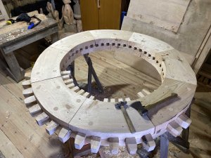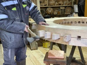 «Зубчатые колеса должны быть надёжны, износостойки, поэтому особое внимание уделяем отбору качественного строительного материала», - заметил плотник-реставратор Алексей Леванидов, осуществляющий комплекс работ.