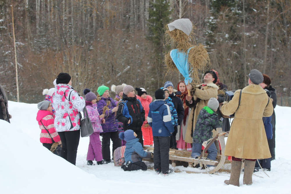 В программе: катание с гор, изготовление чучела масленицы, угощение блинами (заварку, сахар, блины привозит группа), разучивание масленичных закличек и припевок, приход ряженых, кулачные забавы и потехи.