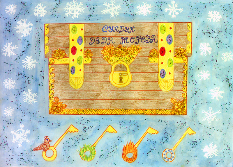 Moroz sees: time bad, time disturbing came. It is necessary from trouble where far away, to hide spells. He then ordered to the masters four chests to make … Difficult chest … And such: that on its one command, through a spell magic, in a moment the invisible could become. "In the first chest, - Father Frost told, - start up fire burns, in the second – the crop ripens. In the third – let water murmurs, is poured, well, and in the fourth – winds blow, to one another in eager rivalry echo". Executed the master Father Frost's order. Here, chests stand are ready. To it it was worth magic saying one word and to strike winter crop with the staff as elements obedient, mild became. Right there his ox obeyed and in chests for the time being hid … Yes, apparently, Father Frost didn't calculate force of the spell … I looked, and on chests of that locks freakish grow. "Here so a miracle - marvelous, a miracle - strange! – thinks and one trouble: where to take keys such that locks intricate opened?"