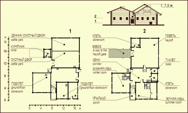 Размеры в плане основных частей памятника в осях составляют изба – 7,8 х 5,6 м; зимовка – 6,5х 6,6 м; двор с сенями – 9,1х 14,9 м.