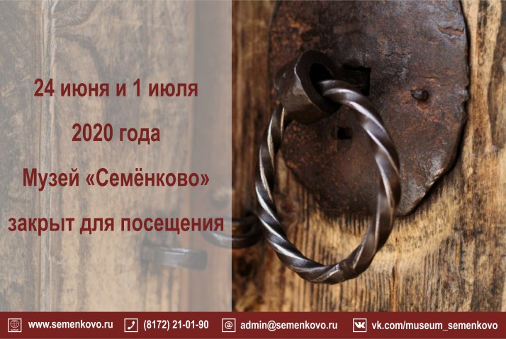 Обращаем ваше внимание, что 24 июня и 1 июля 2020 года музей "Семёнково" закрыт для посещений в связи с объявлением этих дней нерабочими Указом Президента РФ.