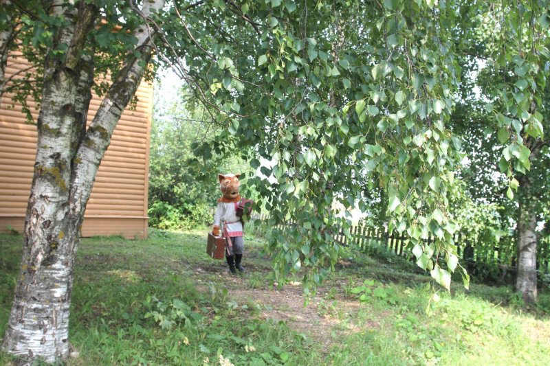 В лучах яркого солнца заиграла всеми красками тотемская роспись. Размашистые объёмные цветы на сурике и лев, напоминающий собачку, привлекли внимание и Кота Семёна. Неожиданно появившись из зарослей кустарника, он нацелил объектив фотоаппарата на роспись. Уже через мгновение появилась памятная фотография. Семён быстро нашёл ей место, прикрепив на крышку чемодана, с которым он в путешествии никогда не расстаётся, ведь там хранятся игры с росписями для детей и взрослых.