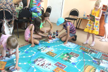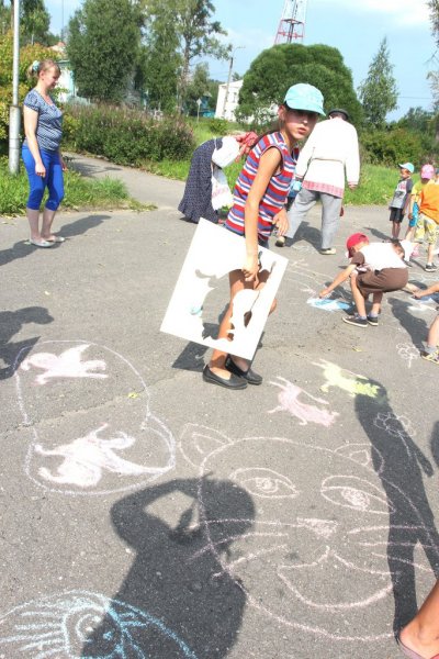 И вновь инициативу перехватил большой затейник Кот Семён. Он предложил всем сфотографироваться на память и, конечно, поиграть! В то время, пока народный мастер России Ольга Гладышева занималась с детьми и взрослыми изучением росписей, Кот развлекал дошколят. Ребята с большим усердием расцветили мелками асфальт. На одной из городских площадей вырос сказочный лес, в котором  прячутся таинственные грифоны, отважные львы, фантастические сирины и кони. А чтобы им было не так одиноко, детвора нарисовала море солнышек, звёздочек, подселила к ним друга филина, а для пригляда за всем поставила Кота Семёна.