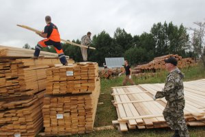 Сразу закипела работа на промышленной зоне. Важно было не просто разгрузить машины, но и сделать всё возможное для обеспечения сохранности материалов. Уж кто, как ни сотрудники Архитектурно-этнографического музея, знают, что дерево при неправильных условиях хранения быстро приходит в негодность.