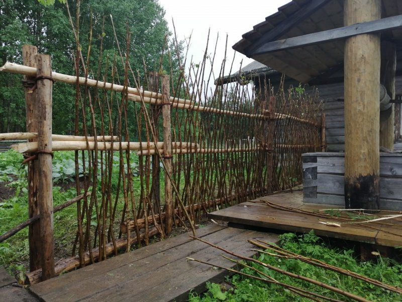 Невзирая на непогоду, сотрудники музея в спешном порядке заготавливали древесный материал и мастерили деревенский плетень. В качестве вертикальных опор использовали устойчивую к гниению ель, обвязку делали гибкими молодыми ёлочками, на них уложили поперечины из осины, а из ивового прута сплели плотную стенку. Теперь появилась надежда, что капуста к осени накатится, а это значит, что состоятся программы осеннего цикла: будем вместе с вами капусту рубить и солить на долгую зиму.