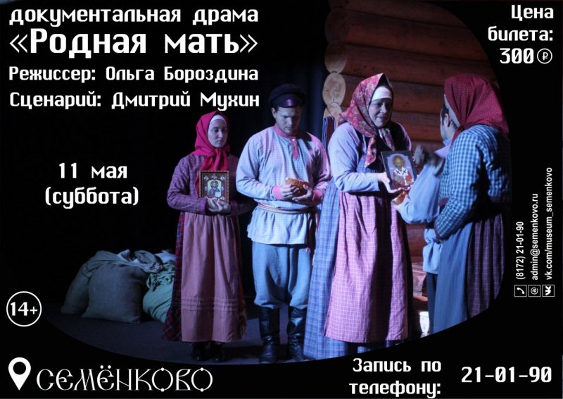 11 мая – открытие III театрального сезона в Антропологическом театре музея «Семёнково». Спектакль «Родная мать» (Бронирование билетов по ссылке).