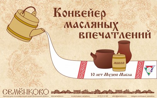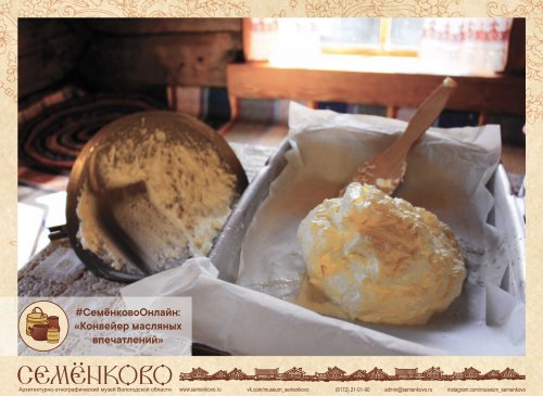 В течение двух недель, в период с 23 ноября по 7 декабря 2020 года, вы узнаете почему "Музей Масла" был открыт именно в Архитектурно-этнографическом музее "Семёнково"; кто стоял у истоков формирования экспозиции; откуда в музее появились уникальные экспонаты. А также мы расскажем: какие курьёзы происходили при монтаже экспозиции; сколько тонн сливочного масла взбили "семёнковские" маслоделы и, наконец, кто на протяжении многих лет является надёжным партнёром музея "Семёнково"?
