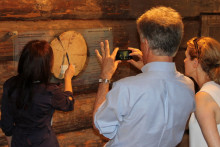 Гости осмотрели весь дом. Поднявшись по широкой лестнице, обрамлённой точёным балясником на второй этаж, увидели недавно приобретённую музеем заборку, выполненную в свободно-кистевой манере. По всей вероятности, работал над ней когда-то опытный и умелый мастер, выработавший с годами свой авторский почерк. Её в ближайшее время предстоит отреставрировать на средства Гранта и установить в верхних сенях.