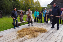 Попробовав свои силы в жатве, не отказались гости и обмолоту зерна поучиться. Взяв в руки молотила, с особым рвением по колосьям ударяли, зерно провеивали, собирали.