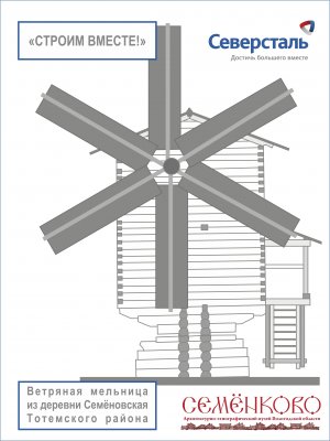 Объект, прототипом которого станет мельница-столбовка из деревни Семёновская Вожбольского сельского поселения Тотемского района, будет представлять собой мельничный амбар с крыльями, посаженный на массивный столб. Его отличительной чертой станет толчея с тремя пестами, которая будет перетирать зерно в крупу. О судьбе утраченной мельницы известно немного. Построенная в 1900 году, она принадлежала Фёдору Ивановичу Талашову. В 40-е годы её забросили. Из-за разросшегося под ней муравейника она сильно накренилась и нижними венцами глубоко ушла в землю.