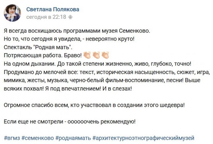 16 и 23 июня 2018 года в Антропологическом театре Музея "Семёнково" пройдёт спектакль «Родная мать»! Открыто бронирование билетов. Помните, количество мест в зрительном зале ограничено.