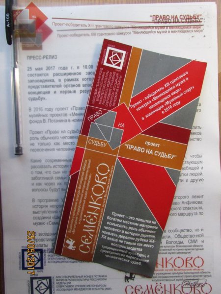 25 мая 2017 года в Юго-западной башне Вологодского кремля состоялось расширенное заседание Ученого совета Вологодского музея-заповедника, посвященное концепции и первым результатам проекта музея «Семенково» «Право на судьбу», победителя XIII грантового конкурса музейных проектов «Меняющийся музей в меняющемся мире» Благотворительного фонда В. Потанина в номинации «Музейный старт».