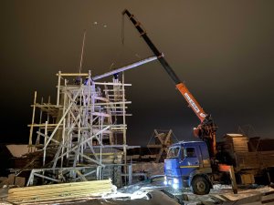 В этот же день удалось при помощи крана разместить в мельнице несколько крепких 7-метровых закладных брёвен. Они были заготовлены ещё летом 2021 года специалистами лесопромышленного концерна Кипелово по заказу музея. Этот материал будет служить основой для площадки, удерживающей "шапку" шатровой мельницы над нижней частью сооружения.