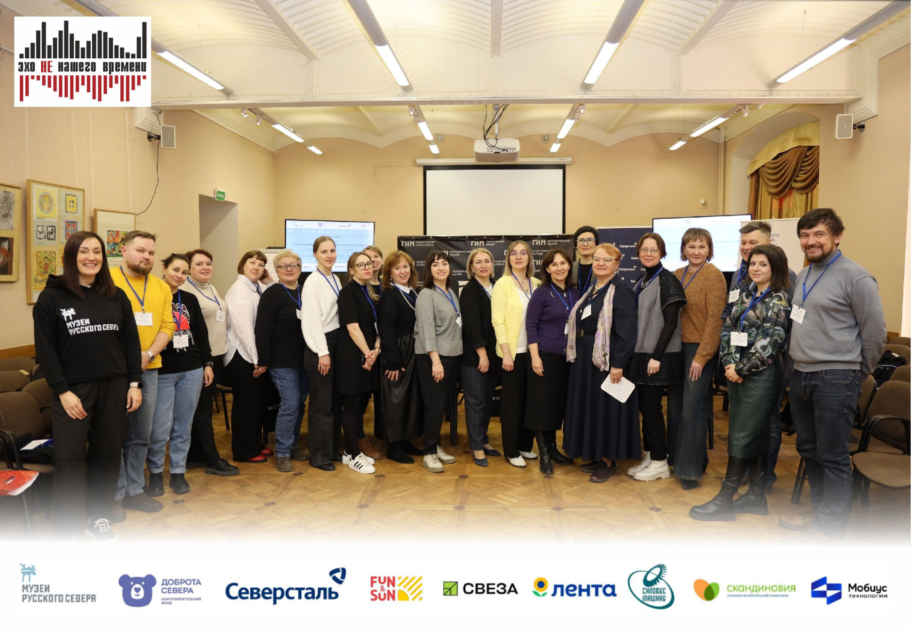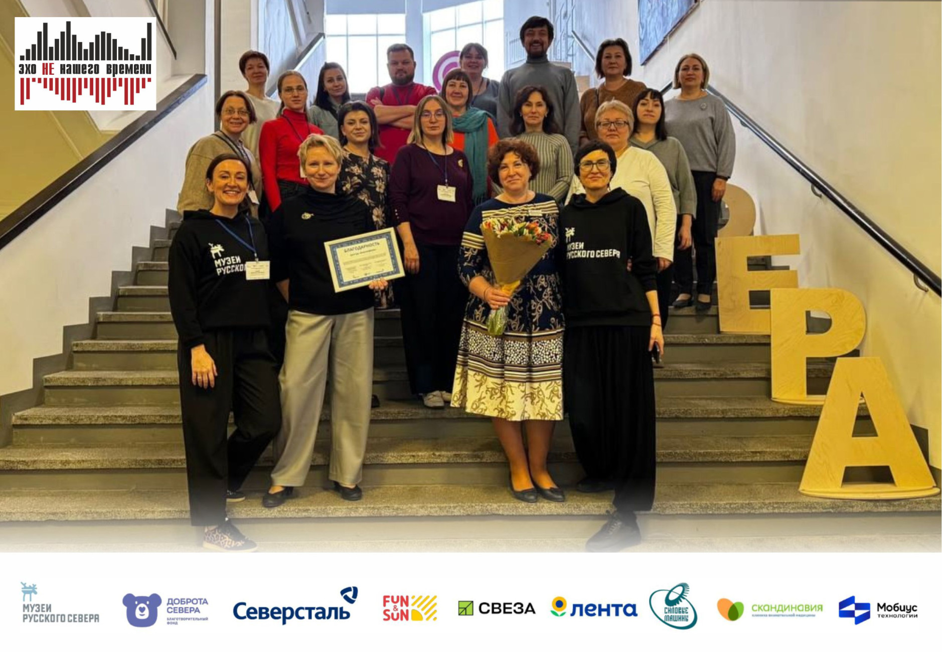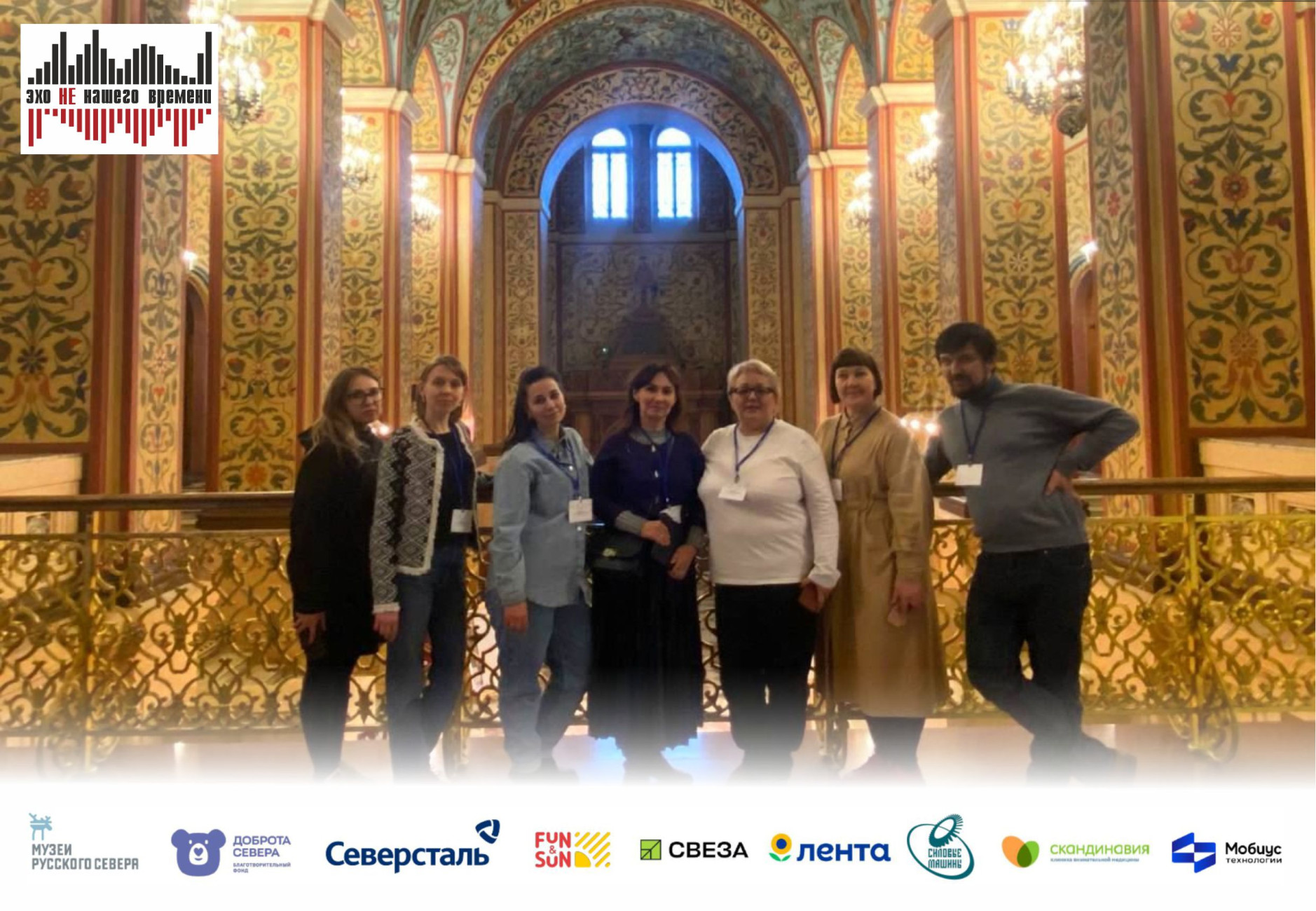 Проект «Эхо НЕ нашего времени» - победитель XV грантового конкурса программы «Музеи Русского Севера» Благотворительного фонда «Доброта Севера» при поддержке компании «Северсталь», компаний-партнеров: «Силовые машины», «Лента», «Скандинавия», «Свеза», FUN&SUN , а также при участии проектной команды и экспертной поддержке «Мобиус Технологии» и «Северсталь-инфоком».