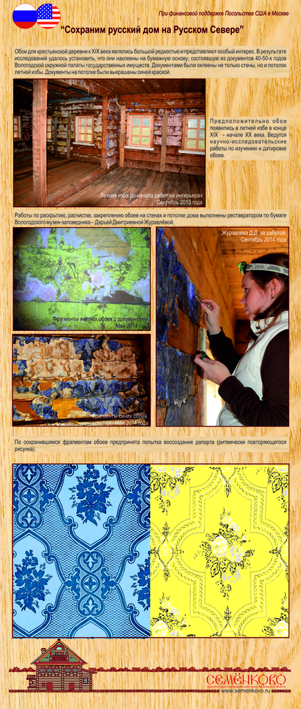 Проект «Сохраним русский дом на Русском Севере» реализовывался в 2011-2014 годах за счет средств гранта фонда американских послов по сохранению культурного наследия Государственного департамента США и средств Посольства США в Москве.