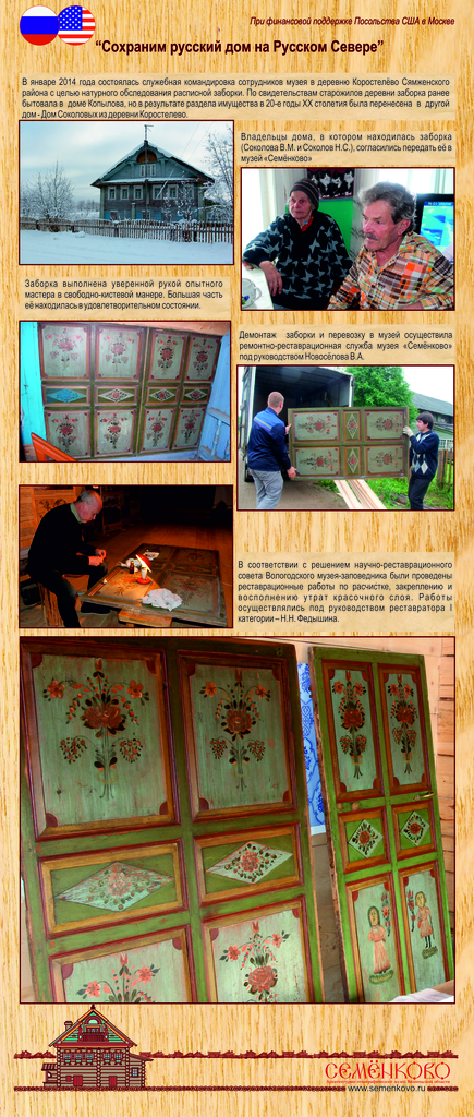 16 октября 2014 года в музее «Семёнково» состоялось подведение итогов проекта «Сохраним русский дом на Русском Севере», направленного на восстановление интерьеров дома Копылова из деревни Коростелёво Сямженского района.